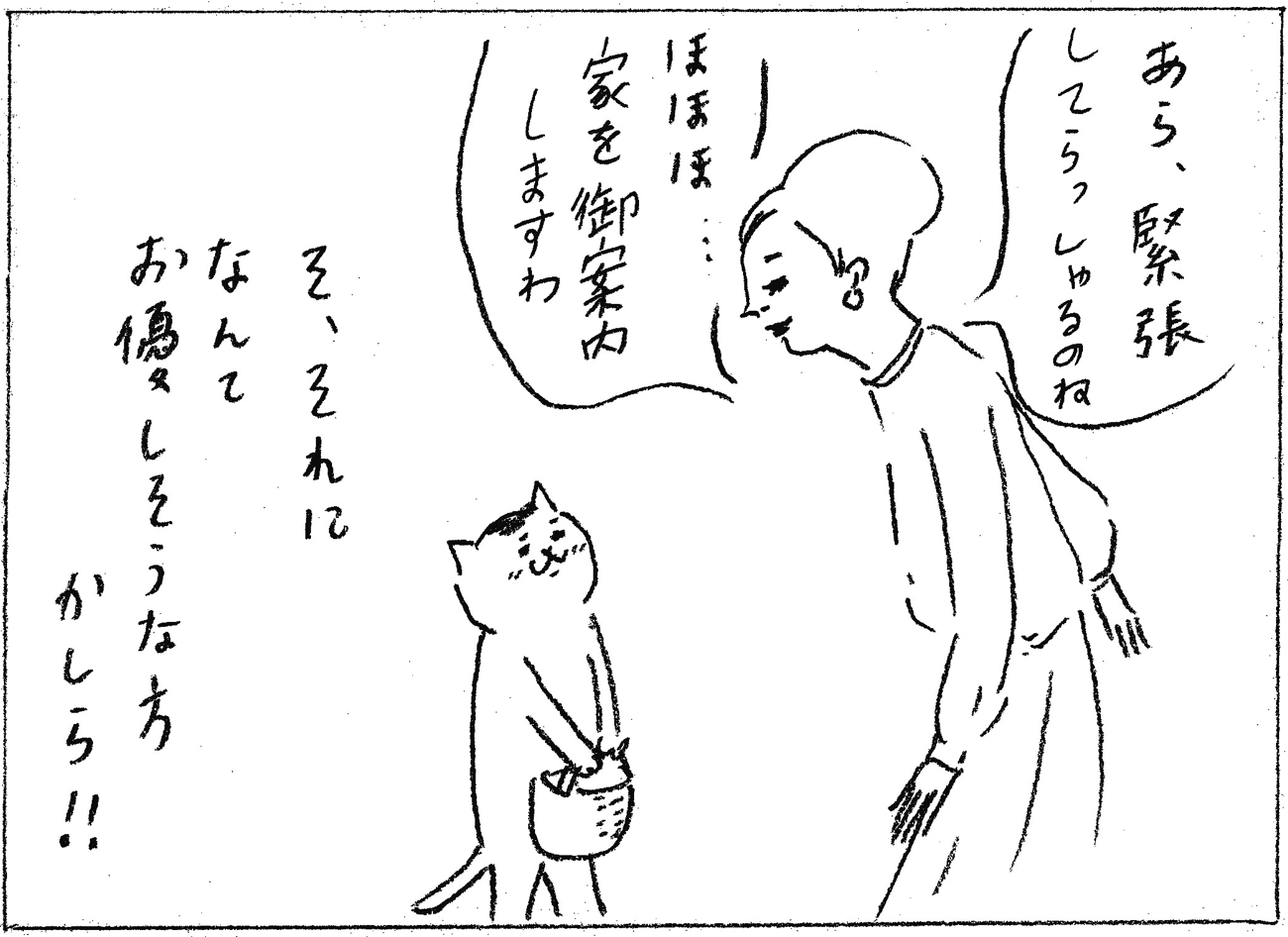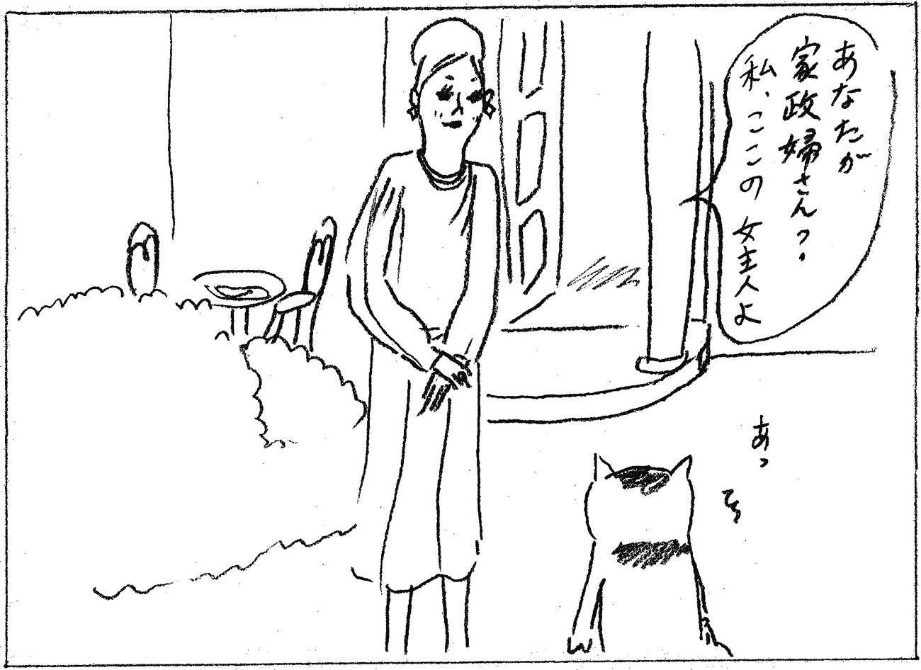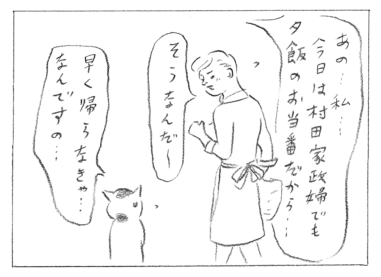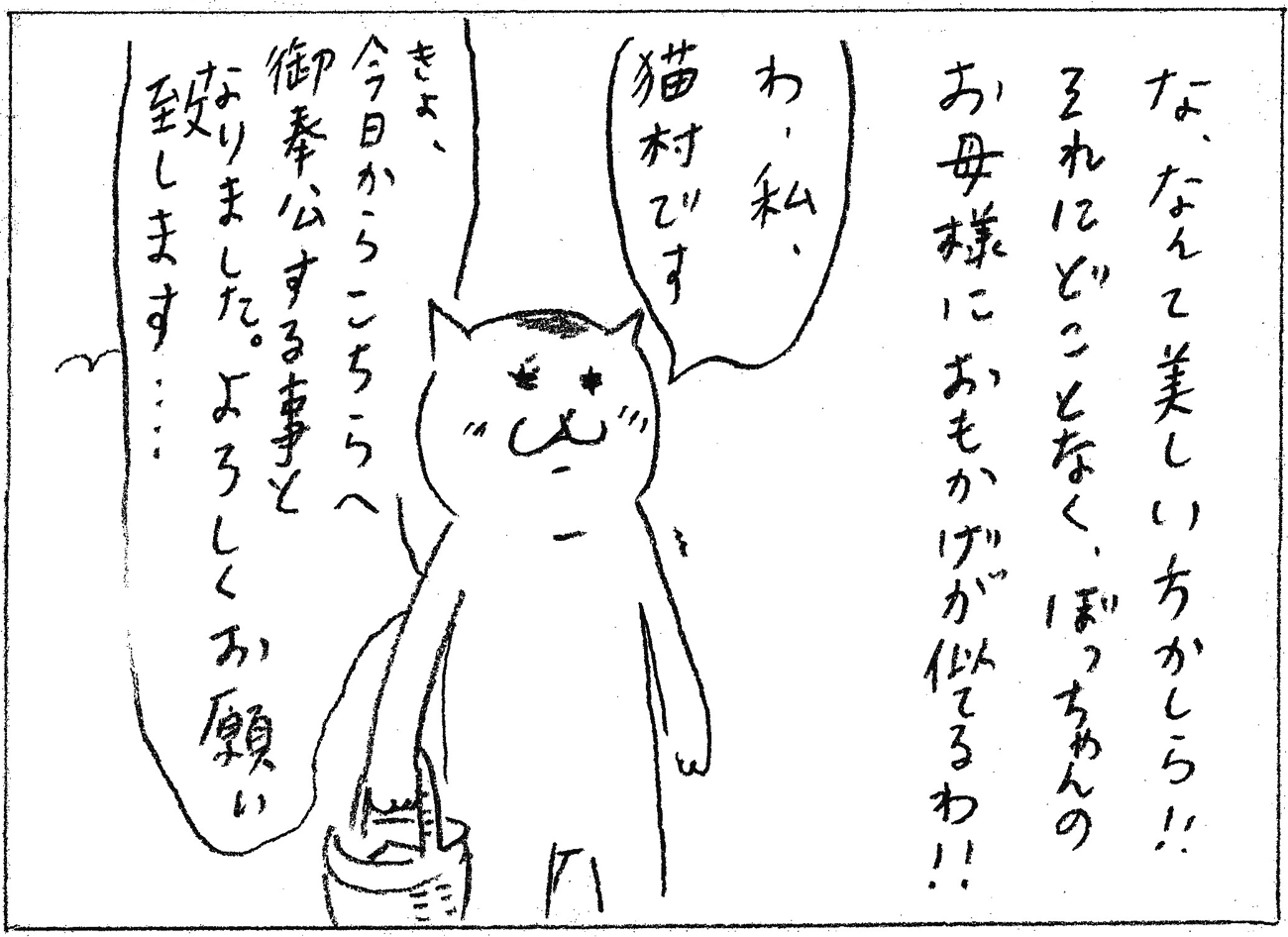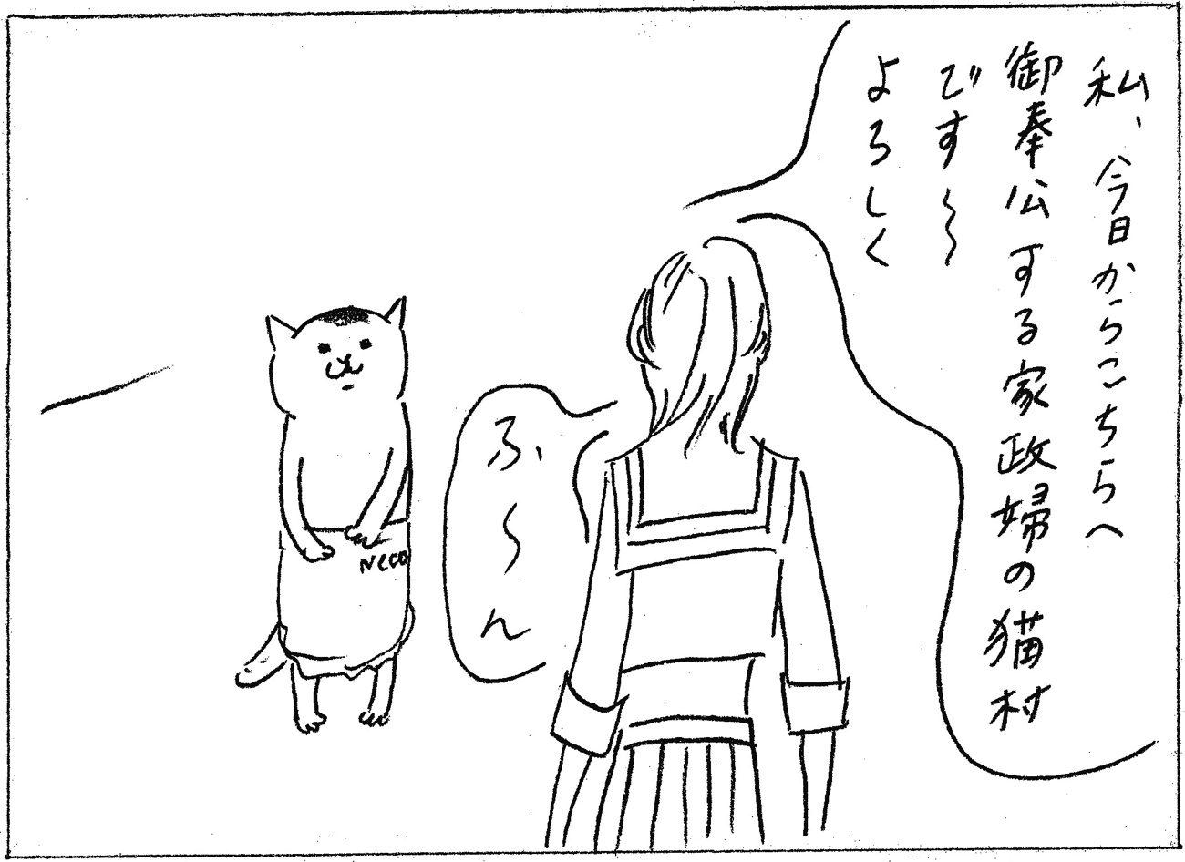 4歳。親猫とはぐれ、迷子だった猫の頃に、ぼっちゃんに拾われる。ぼっちゃんの両親の離婚により、最愛のぼっちゃんと離ればなれに。自立するため村田家政婦紹介所に勤務。現在の奉公先は犬神家。ぼっちゃんからもらったピンクのエプロンが一番大切なもの。