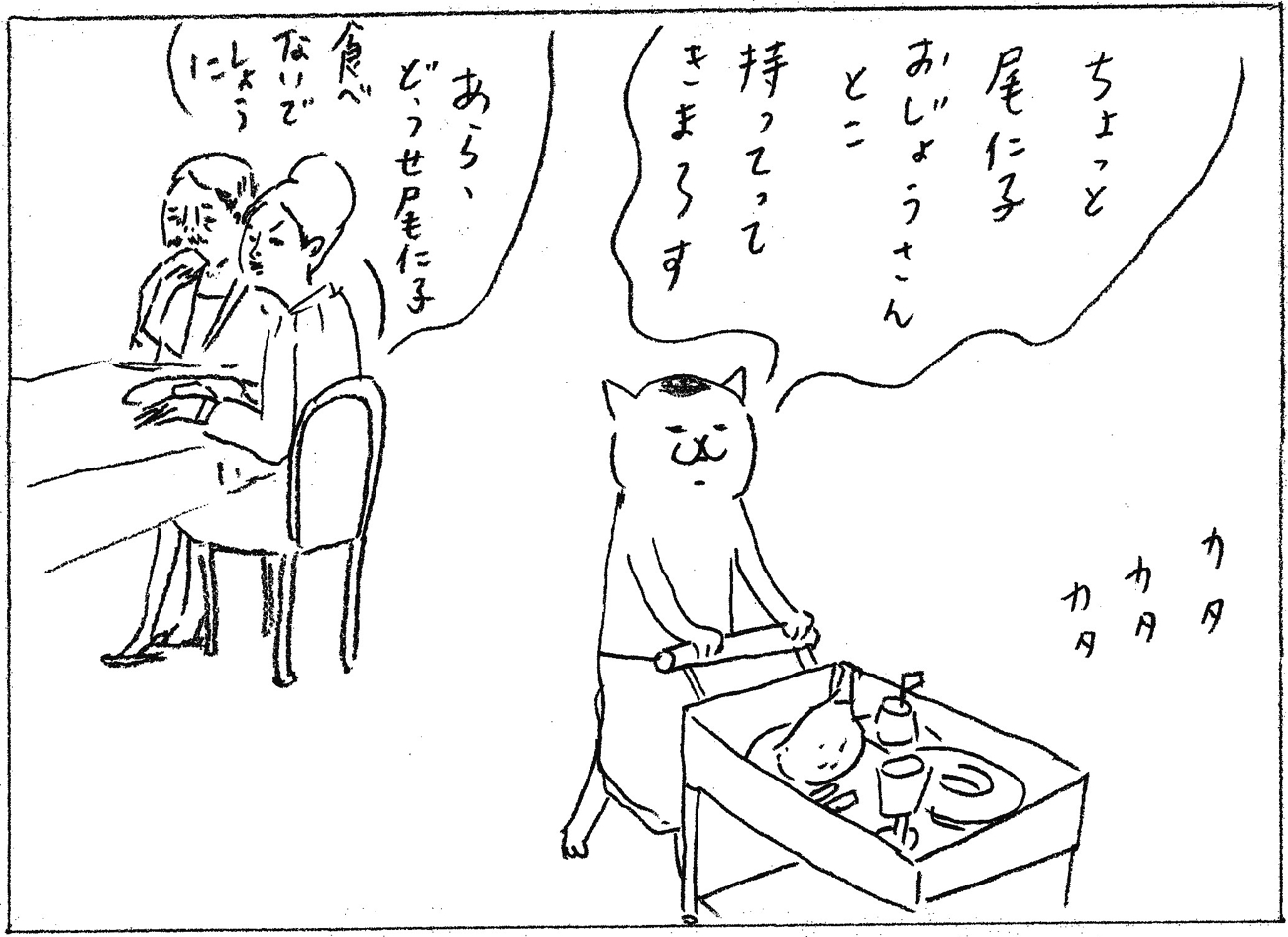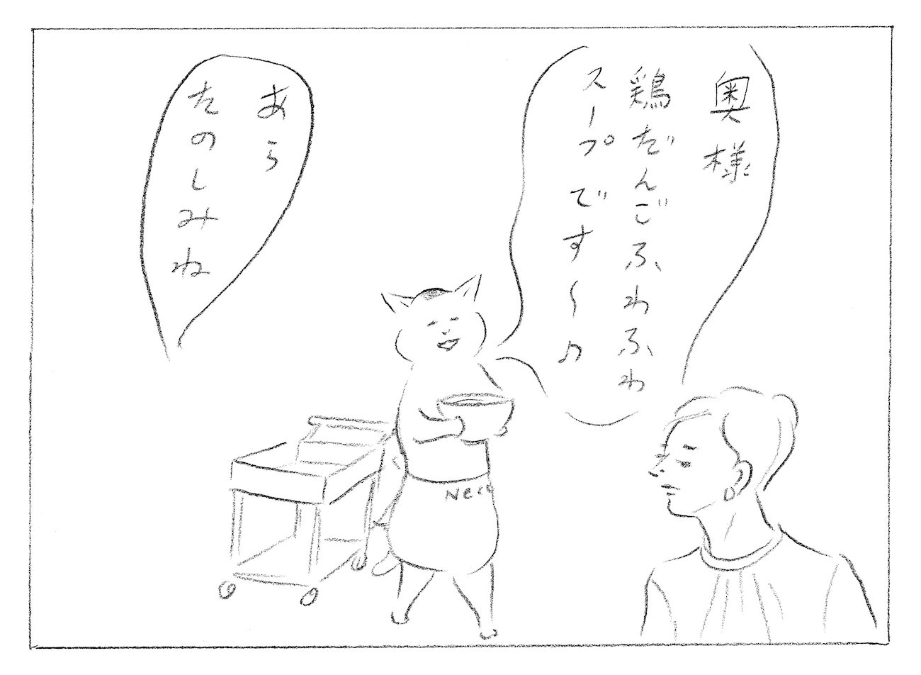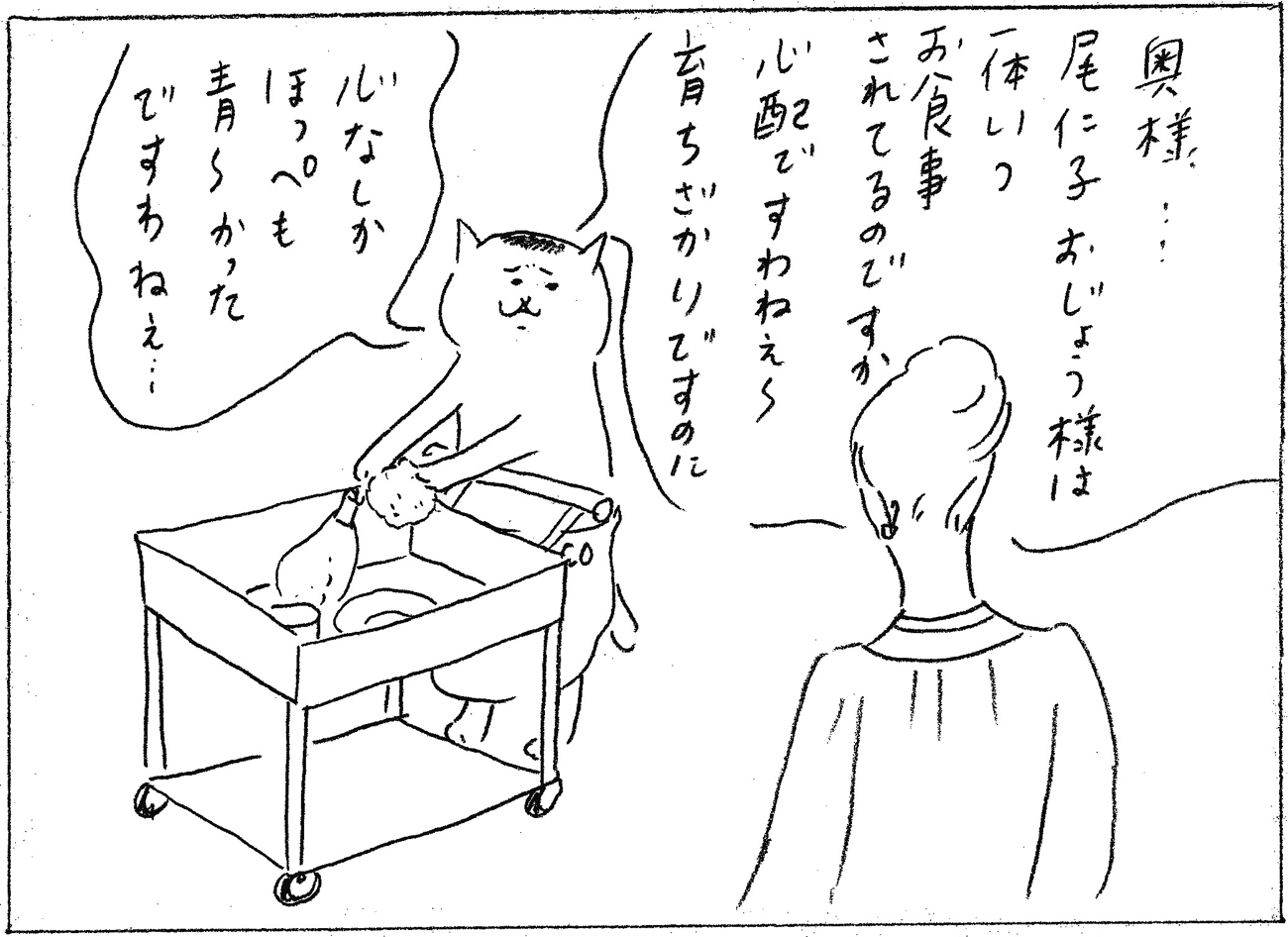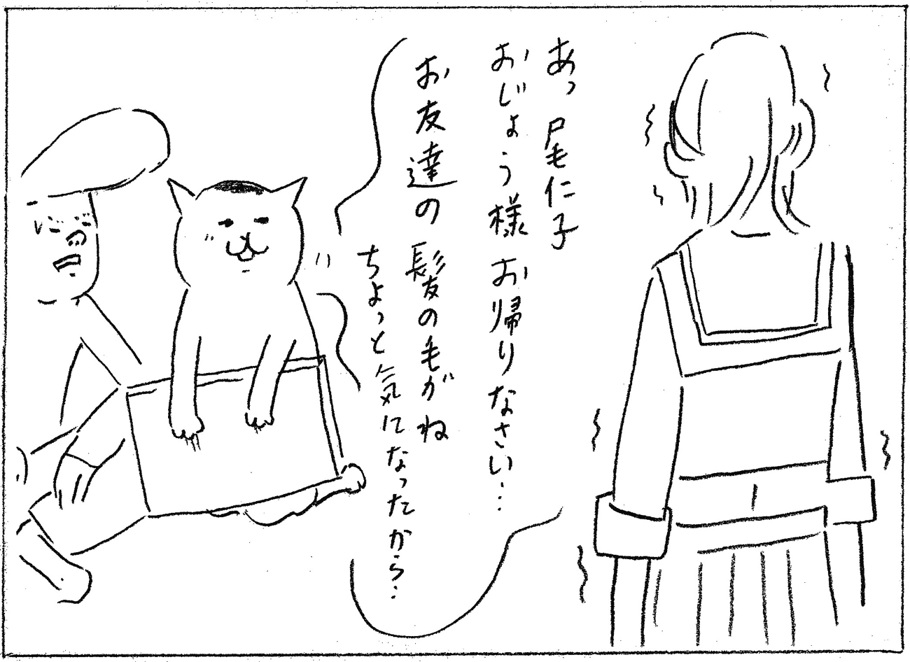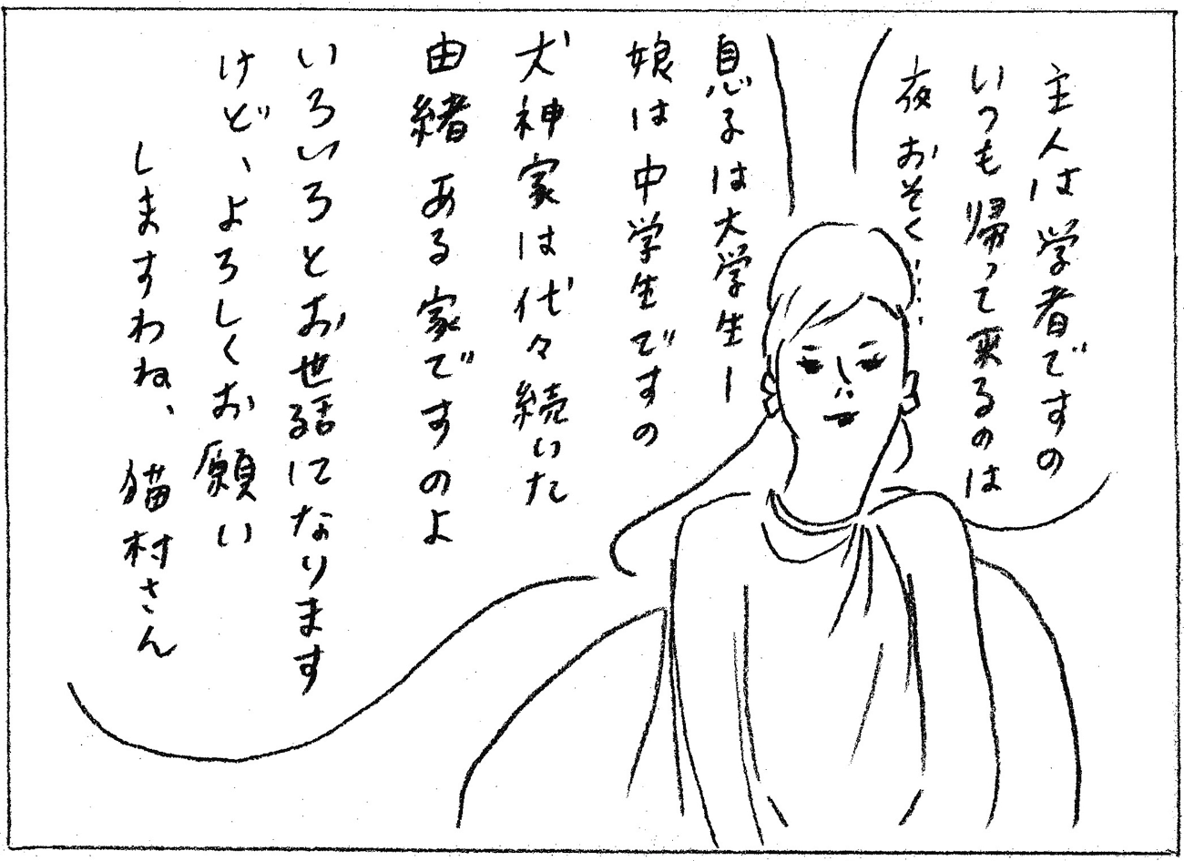 4歳。親猫とはぐれ、迷子だった猫の頃に、ぼっちゃんに拾われる。ぼっちゃんの両親の離婚により、最愛のぼっちゃんと離ればなれに。自立するため村田家政婦紹介所に勤務。現在の奉公先は犬神家。ぼっちゃんからもらったピンクのエプロンが一番大切なもの。