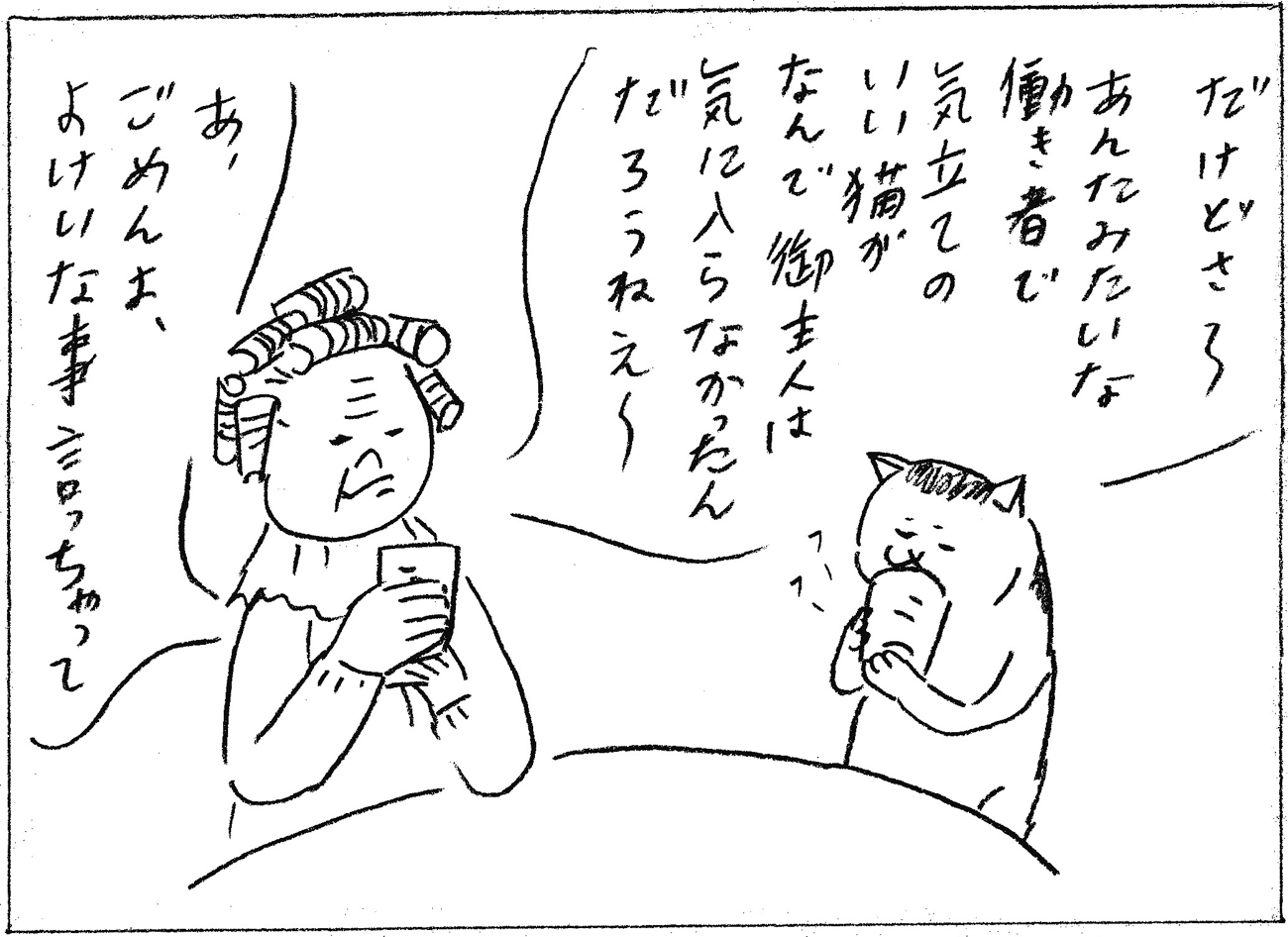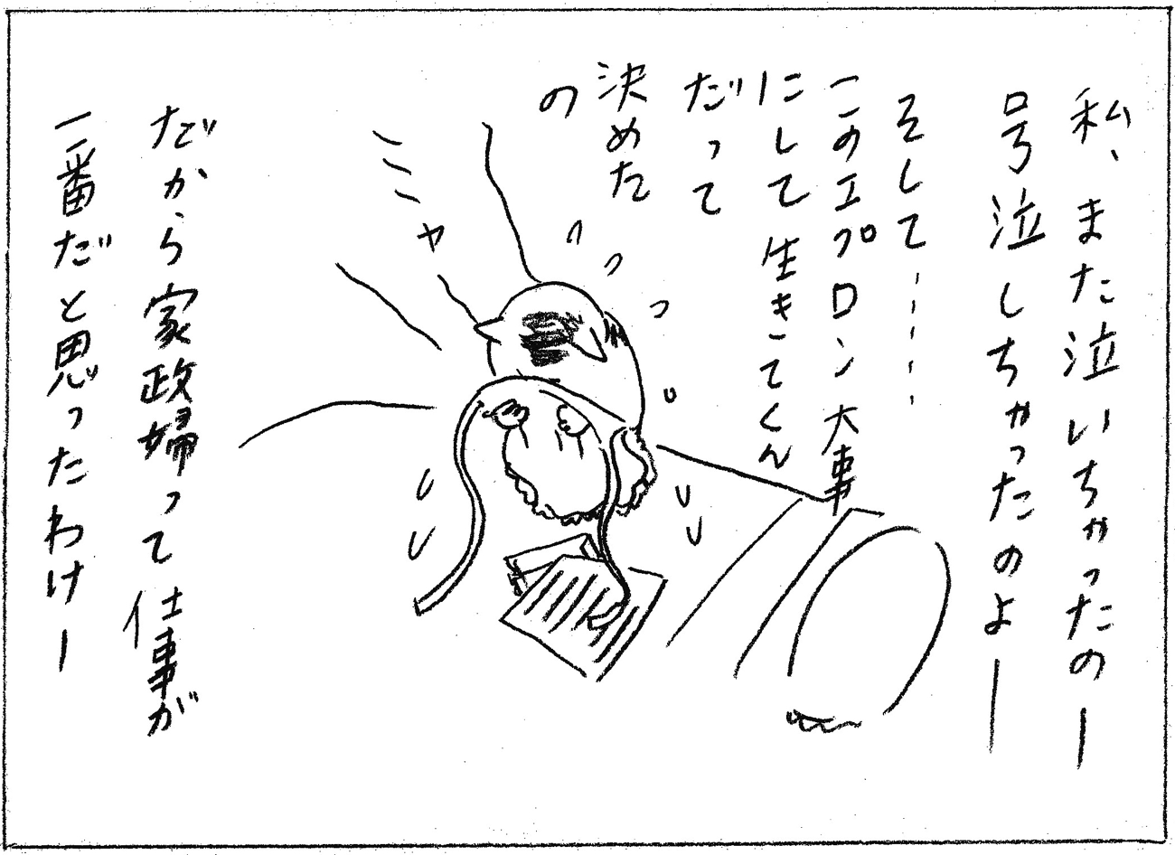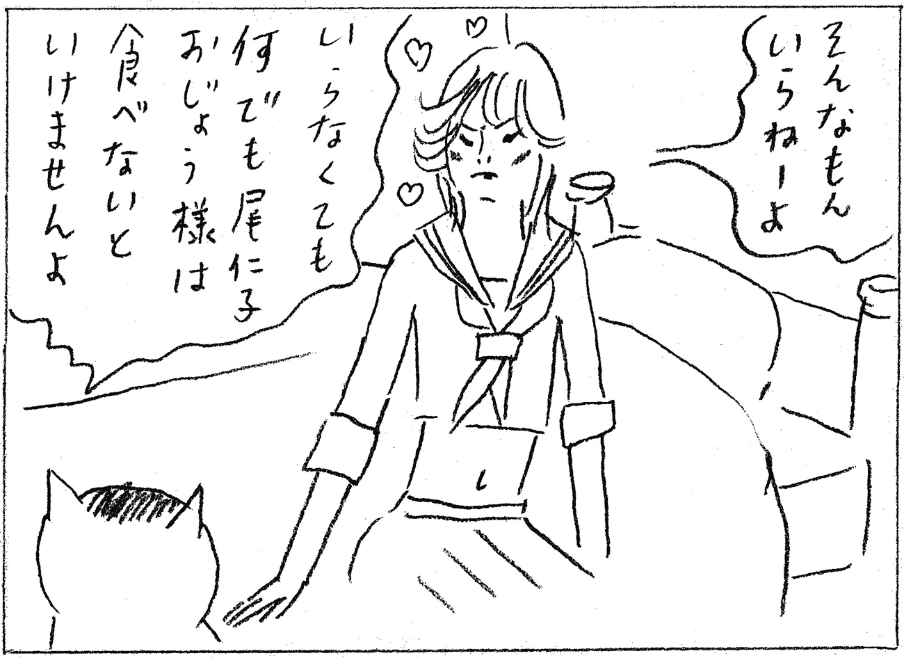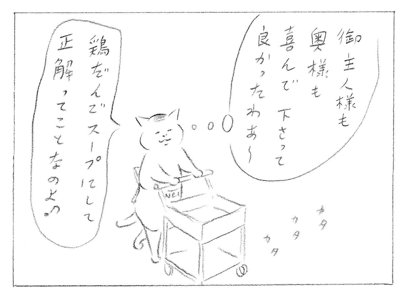 4歳。親猫とはぐれ、迷子だった猫の頃に、ぼっちゃんに拾われる。ぼっちゃんの両親の離婚により、最愛のぼっちゃんと離ればなれに。自立するため村田家政婦紹介所に勤務。現在の奉公先は犬神家。ぼっちゃんからもらったピンクのエプロンが一番大切なもの。