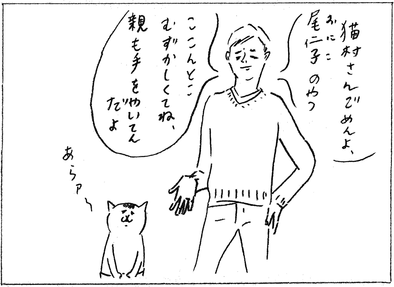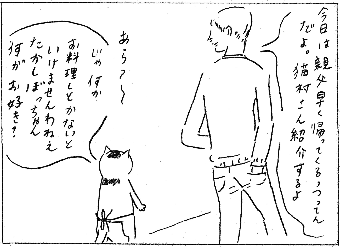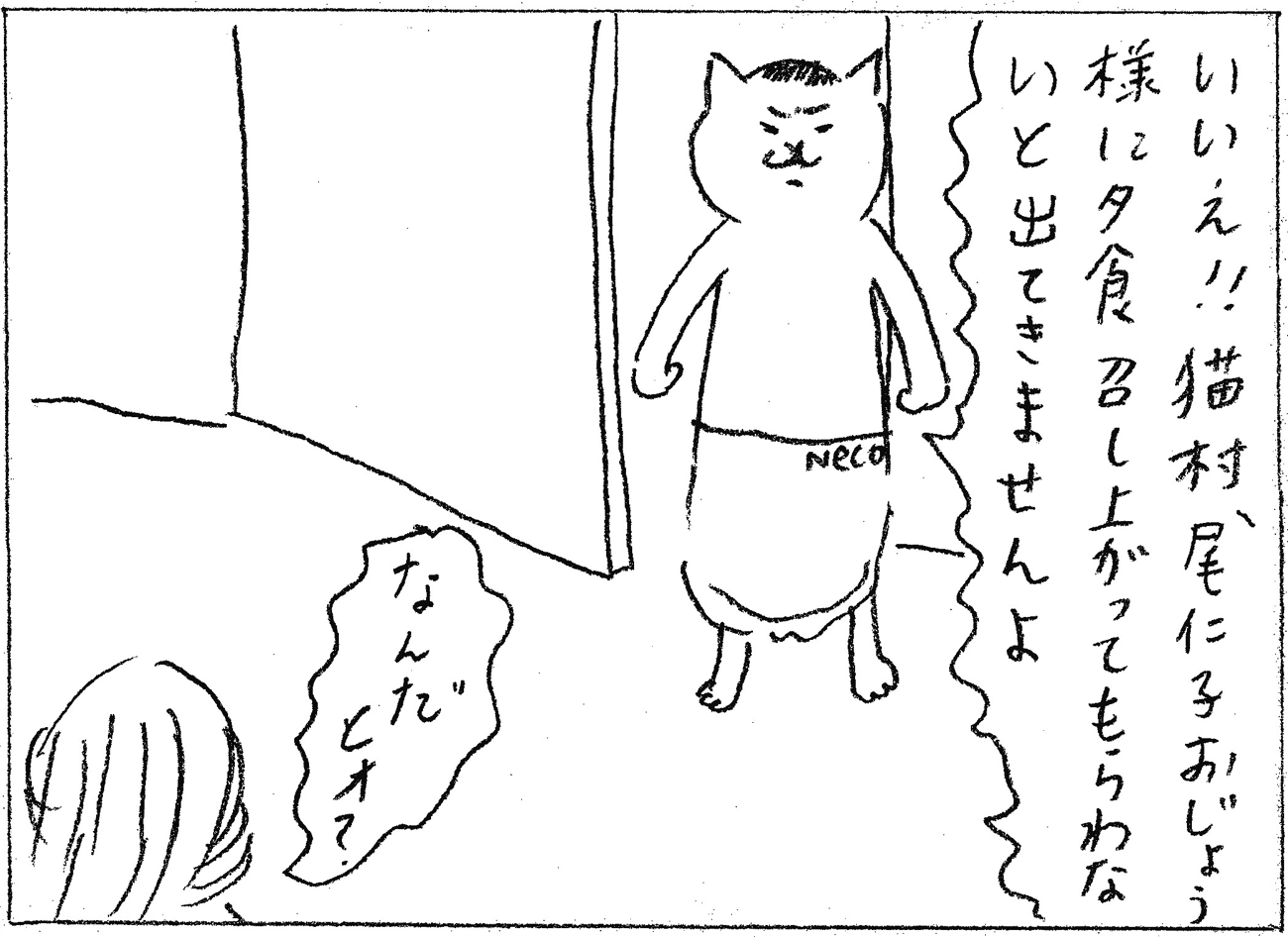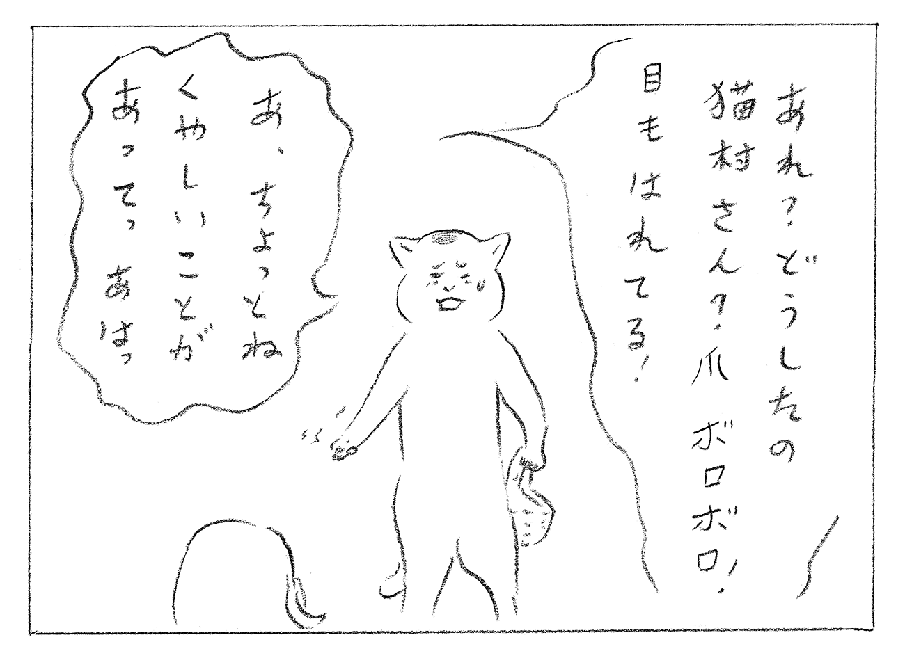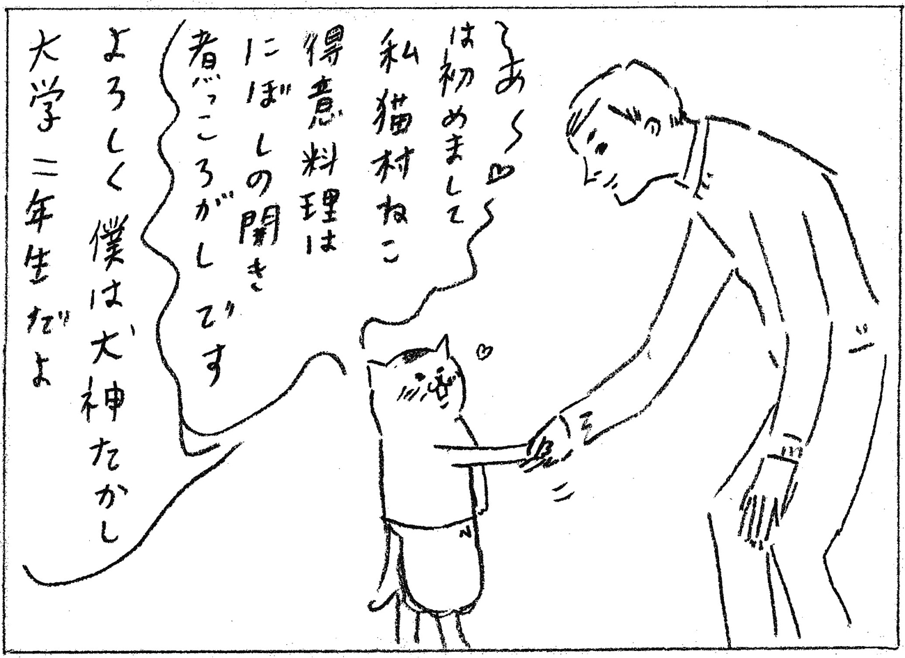 犬神たかし。大学4年生。就職活動にいそしみ、見事九十九商事の内定を取り付ける。権利と将来展望への野望が強く、やや周りの人を見下しがち。家族に対しての感情は醒めがちであるが、猫村ねこへの気遣いを見せる優しい一面もある。